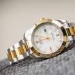 • The light reflections on the case sides and lugs highlight the elegant profile of the 31 mm Oyster case, which is fitted with a domed bezel. Aesthetically, the Datejust has spanned eras, while retaining the enduring codes that make it, notably in its traditional versions, one of the most recognized and recognizable of watches.