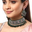 Silver Plated Green & Pink Stone-Studded Traditional Choker Necklace With Earrings Jewellery
