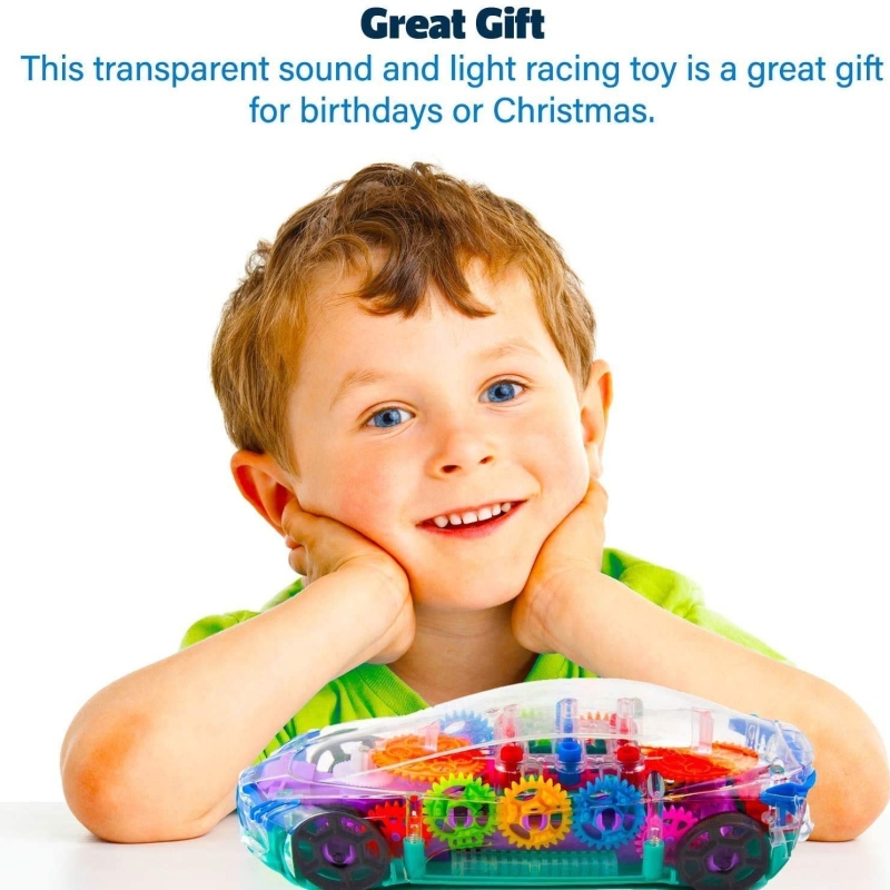 • Transparent Concept Racing Car with 3D Flashing Lights car with functions: Forward/ Backward, Stop. Unique Design - Transparent design, one Can see the gear inside, helps the kids to know mechanical concept.